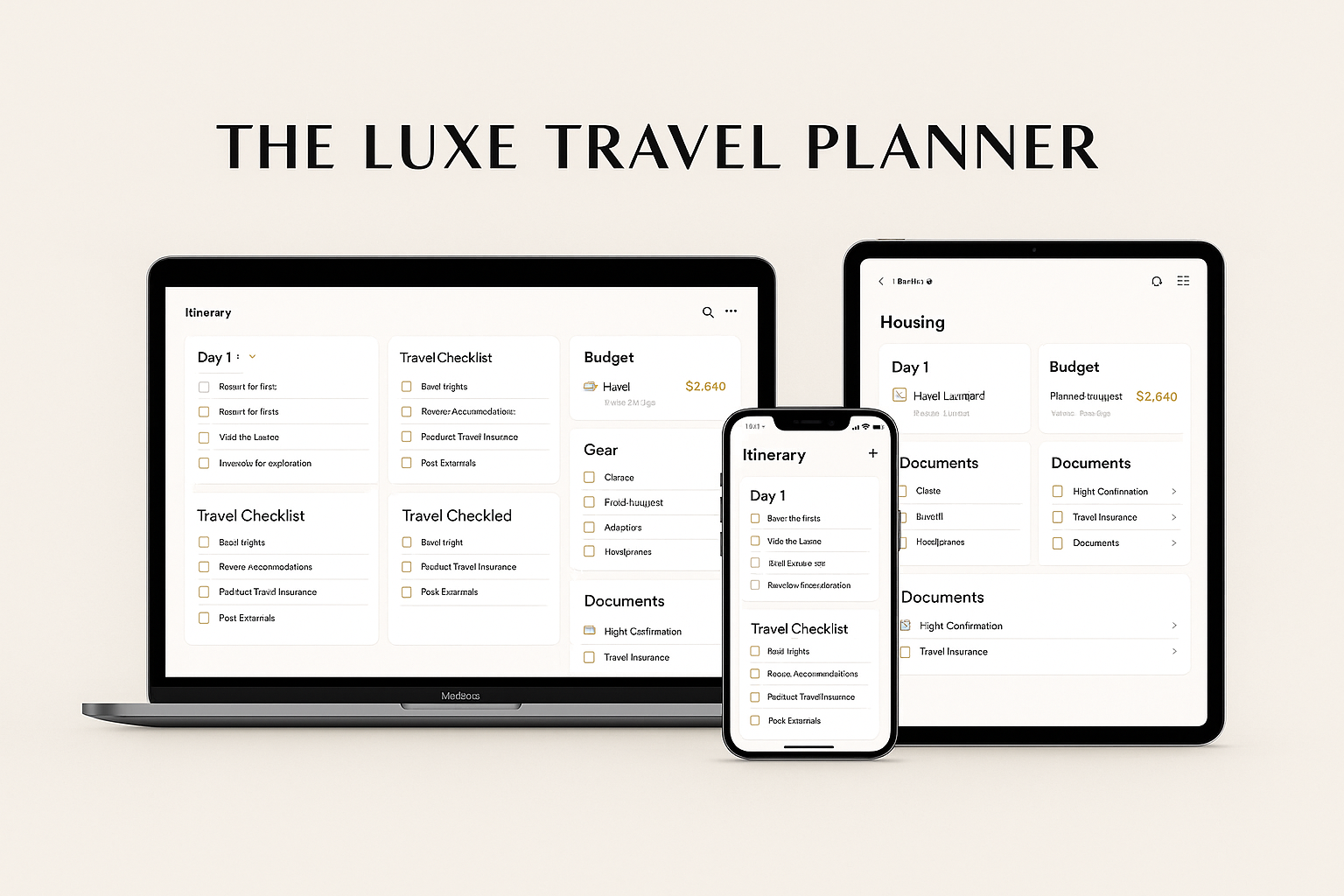 The Luxe Travel Planner was created to streamline all of it — so every trip (from weekend escapes to international dive adventures) feels organized, elegant, and beautifully simple.